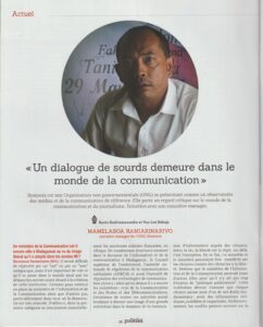 “Une dialogue de sourds demeure dans le monde de la communication” In Politikà édition n°25 page 38 à 39 Dans un monde où l’information circule à une vitesse fulgurante, la communication à Madagascar reste traversée par des contradictions, des tensions et parfois… un véritable dialogue de sourds. Entre les institutions de régulation, les médias publics et privés, les autorités politiques et les citoyens, la question du rôle et de l’utilité d’un ministère de la Communication demeure au cœur du débat. Observatoire indépendant et critique, Ilontsera se positionne comme un acteur